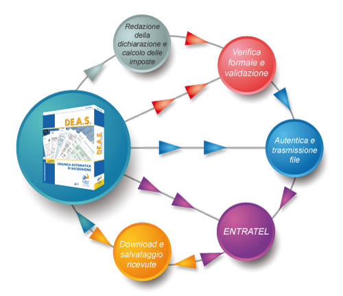 La validazione, l'autenticazione e la trasmissione della dichiarazione possono essere fatte automaticamente da DE.A.S. oppure utilizzando Desktop Telematico e i canali Entratel o Fisconline.