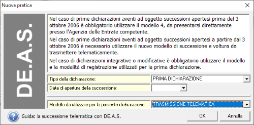 DE.A.S. permette di selezionare, sulla base della tipologia di dichiarazione e della data di apertura della successione, quale modello utilizzare: