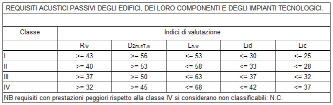 Il decreto introduce una serie di valori, distinti per categoria, relativi agli indici di valutazione del potere fonoisolante apparente di partizioni fra ambienti (R'w), dell'isolamento acustico standardizzato di facciata (D2m,nT,w), del livello di rumore di calpestio normalizzato (Ln,w). Sono definiti anche i limiti massimi di rumorosità per gli impianti a funzionamento sia continuo che discontinuo.