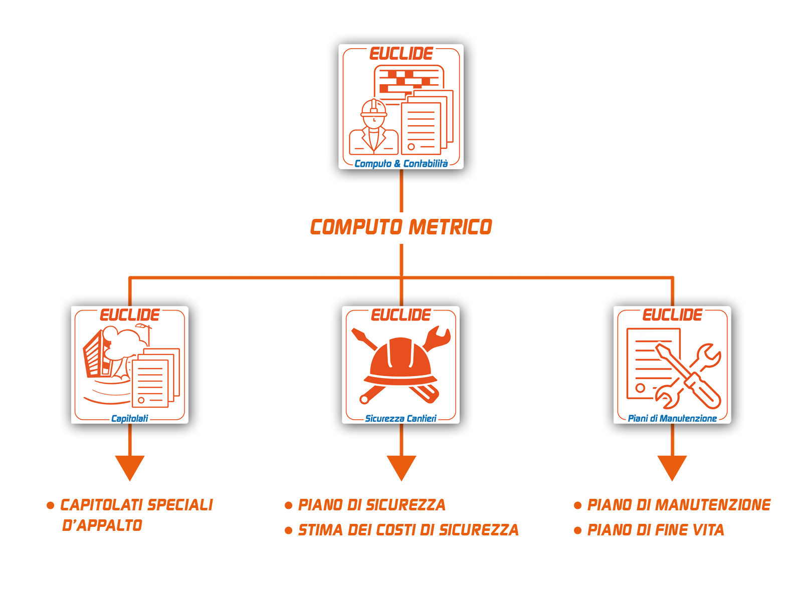 Il software è pienamente integrato con le altre applicazioni Geo Network ed in particolare con Euclide Sicurezza Cantieri, Euclide Capitolati ed Euclide Piani di Manutenzione.
