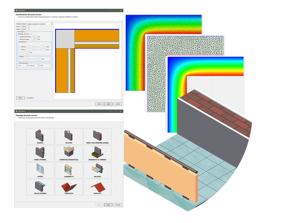 Euclide Ponti Termici è un modulo di Euclide Certificazione Energetica 2024 (PRO o LT), per il calcolo della trasmittanza lineica, del flusso termico, delle temperature e la verifica della formazione di muffa nei ponti termici secondo le norme tecniche di cui alle norme UNI EN ISO 10211:2017 ed UNI EN ISO 13788:2013.