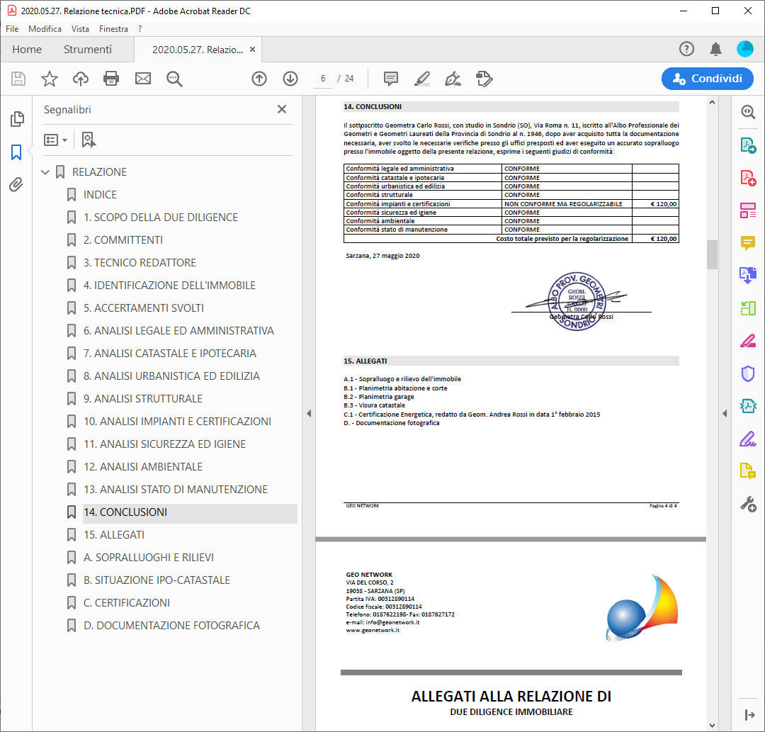 Expert Due Diligence Immobiliare genera una relazione (in formato PDF o in formato RTF) contenente anche tutti gli allegati inseriti all'interno della pratica.
