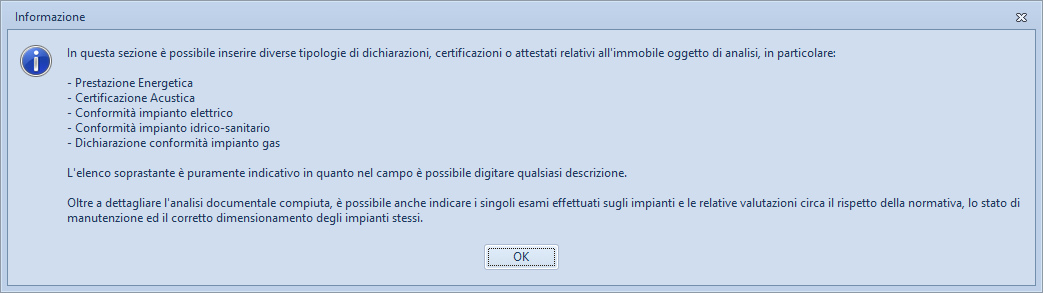 In ciascuna sezione è presente un pulsante informazioni che visualizza un breve sunto delle informazioni da inserire