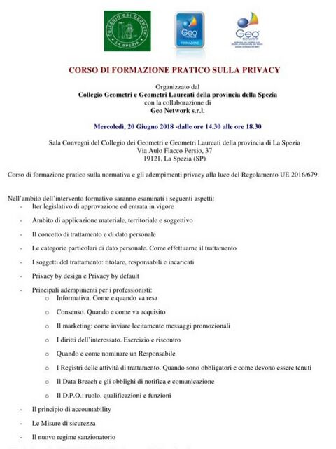 Bellissimo convegno organizzato dal Collegio dei Geometri della Spezia e Geo Network sui diversi articoli del Regolamento UE entrato in vigore il 25 Maggio 2018, molto apprezzata dai Geometri che già utilizzano i software Geo Network la completa interazione con essi di Expert Privacy