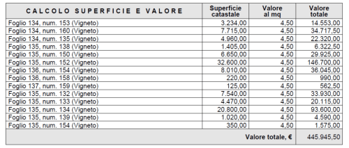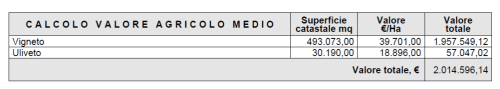 Specificando il valore ad ettaro, prendendo eventualmente come riferimento la banca dati dell’osservatorio del mercato immobiliare, verrà calcolato il valore VAM per l’intero immobile.