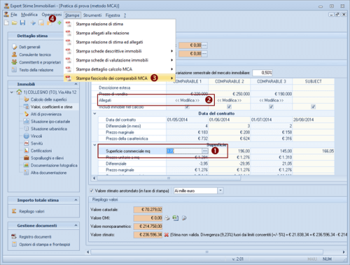 Expert Stime & Esecuzioni Immobiliari consente di redigere perizie complete di tutti gli allegati e di effettuare la stima tramite metodo MCA (Market Comparison Approach), per confronto diretto, per capitalizzazione del reddito e per valore di costruzione.