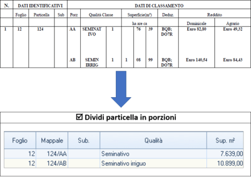 In caso di particelle con colture diverse, è disponibile l’opzione "Dividi particelle in porzioni" che, se attivata, riconosce le diverse colture della medesima particella e le inserisce con i relativi redditi dominicali, redditi agrari e superfici.